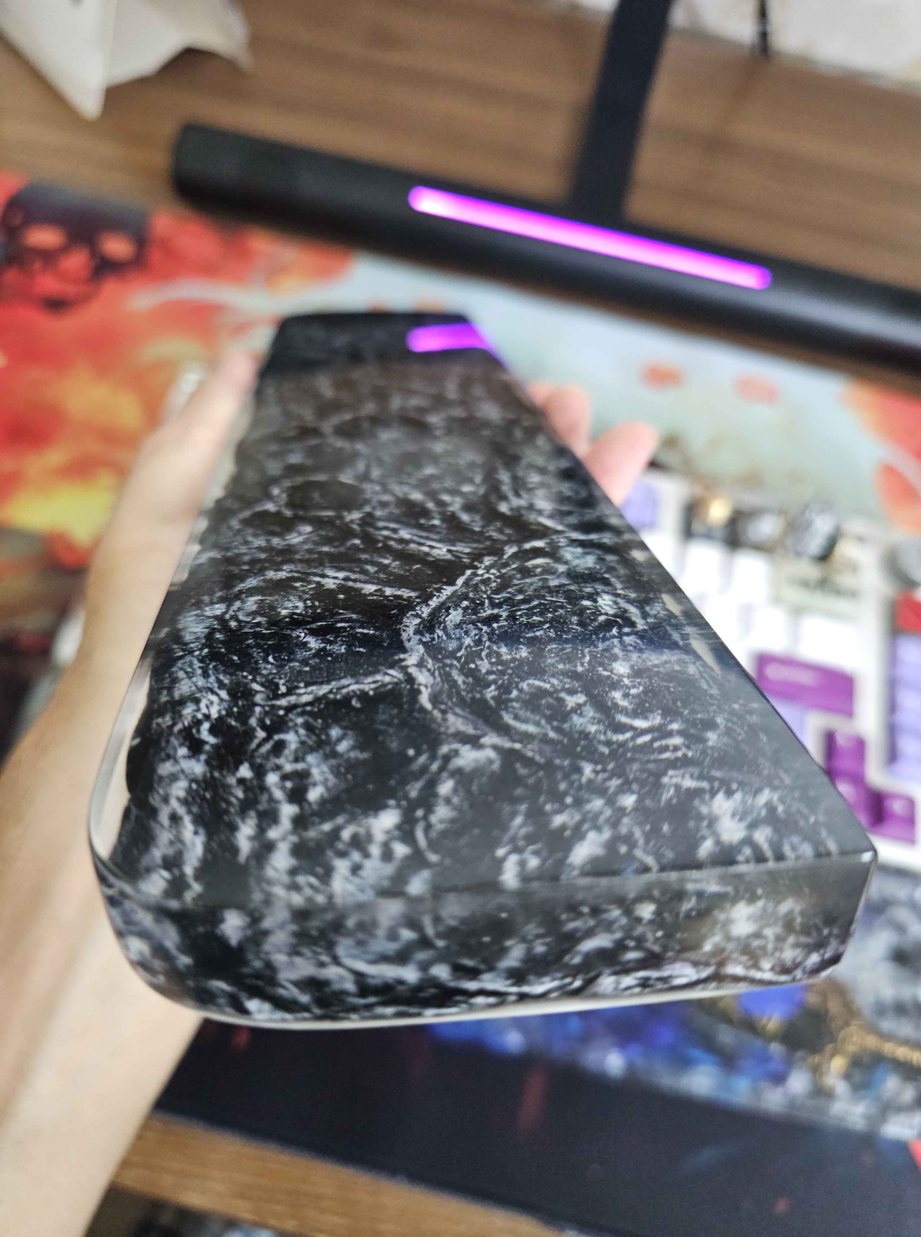 رزین استفاده‌شده در این محصول با دقت پرداخت و صیقل داده شده تا سطحی صاف، خنک و مقاوم در برابر خط و خش ایجاد کند. هر قطعه به‌صورت دست‌ساز ساخته می‌شود و طرح آن کاملاً خاص و متفاوت است — درست مثل یک اثر هنری کوچک روی میز شما.