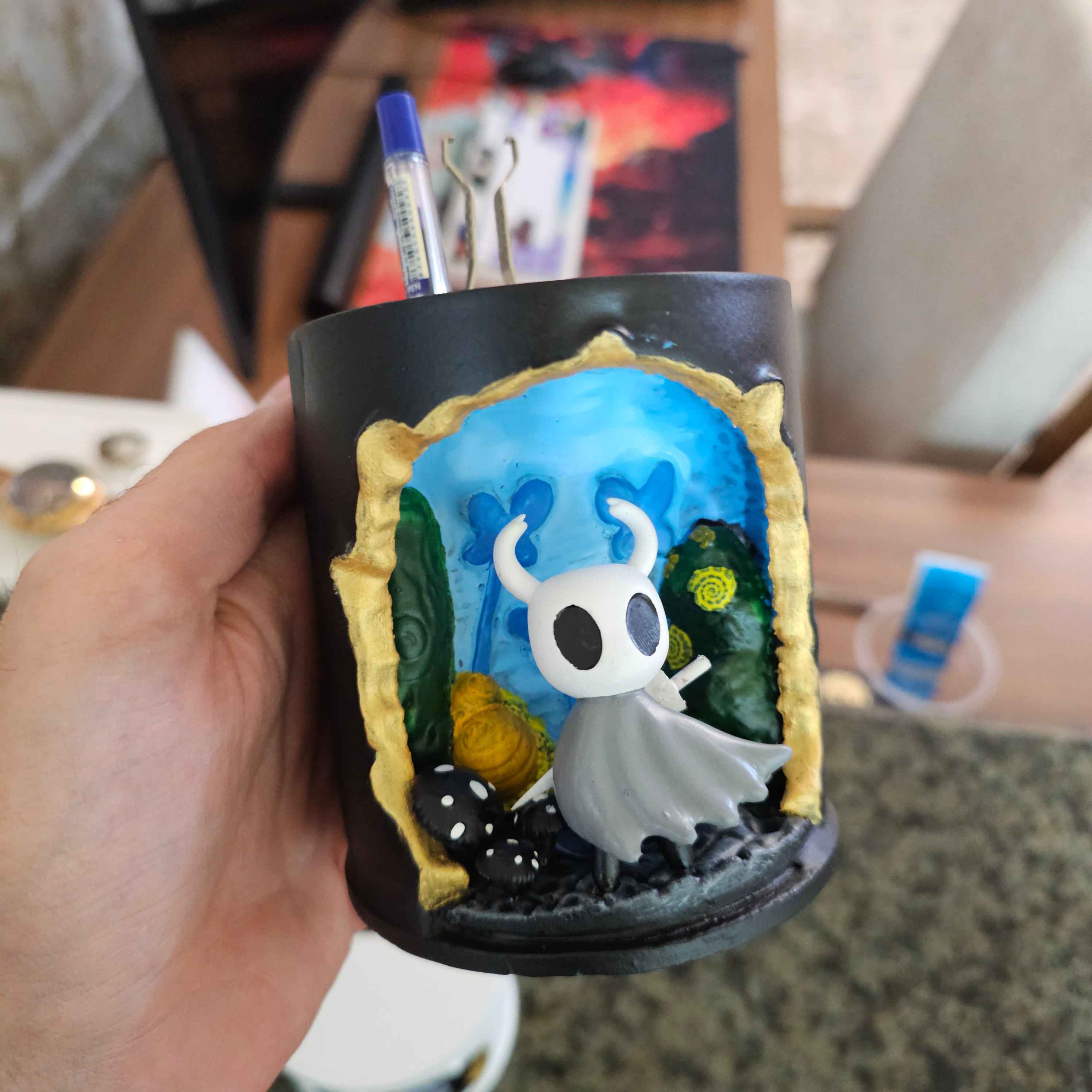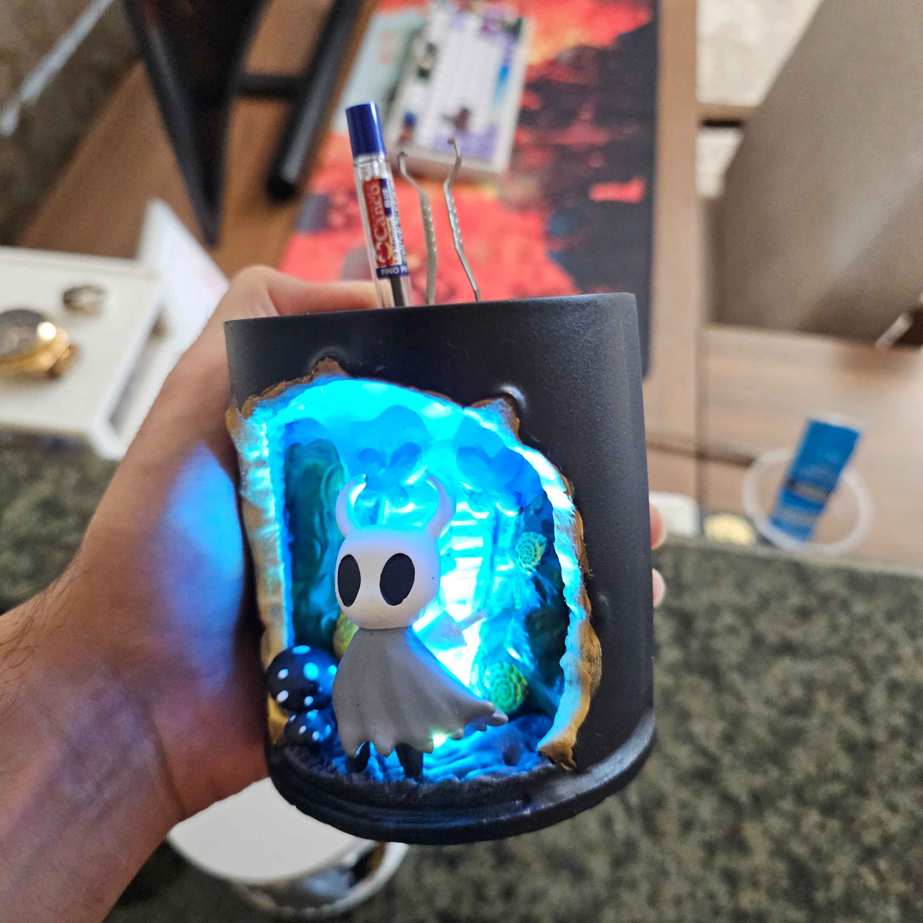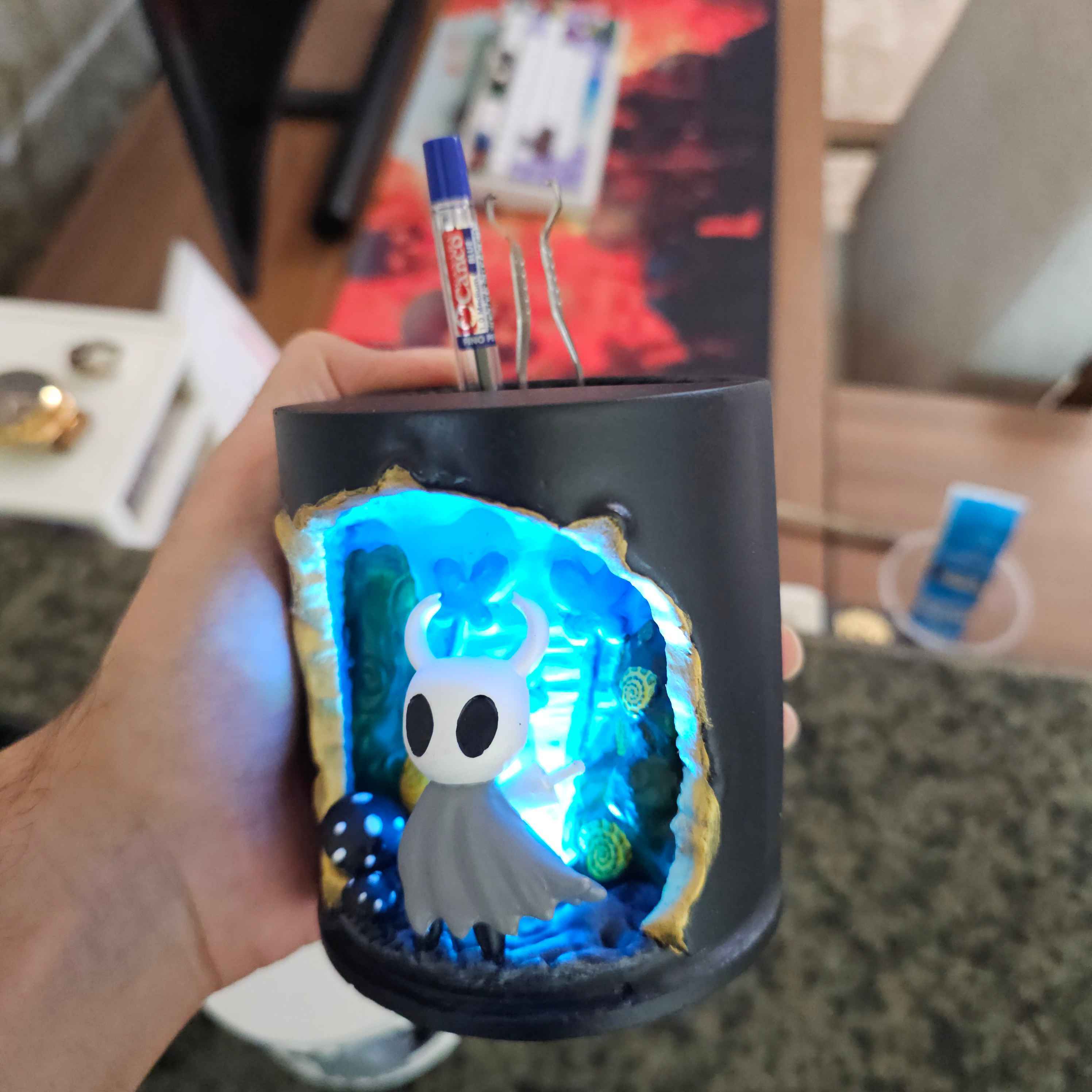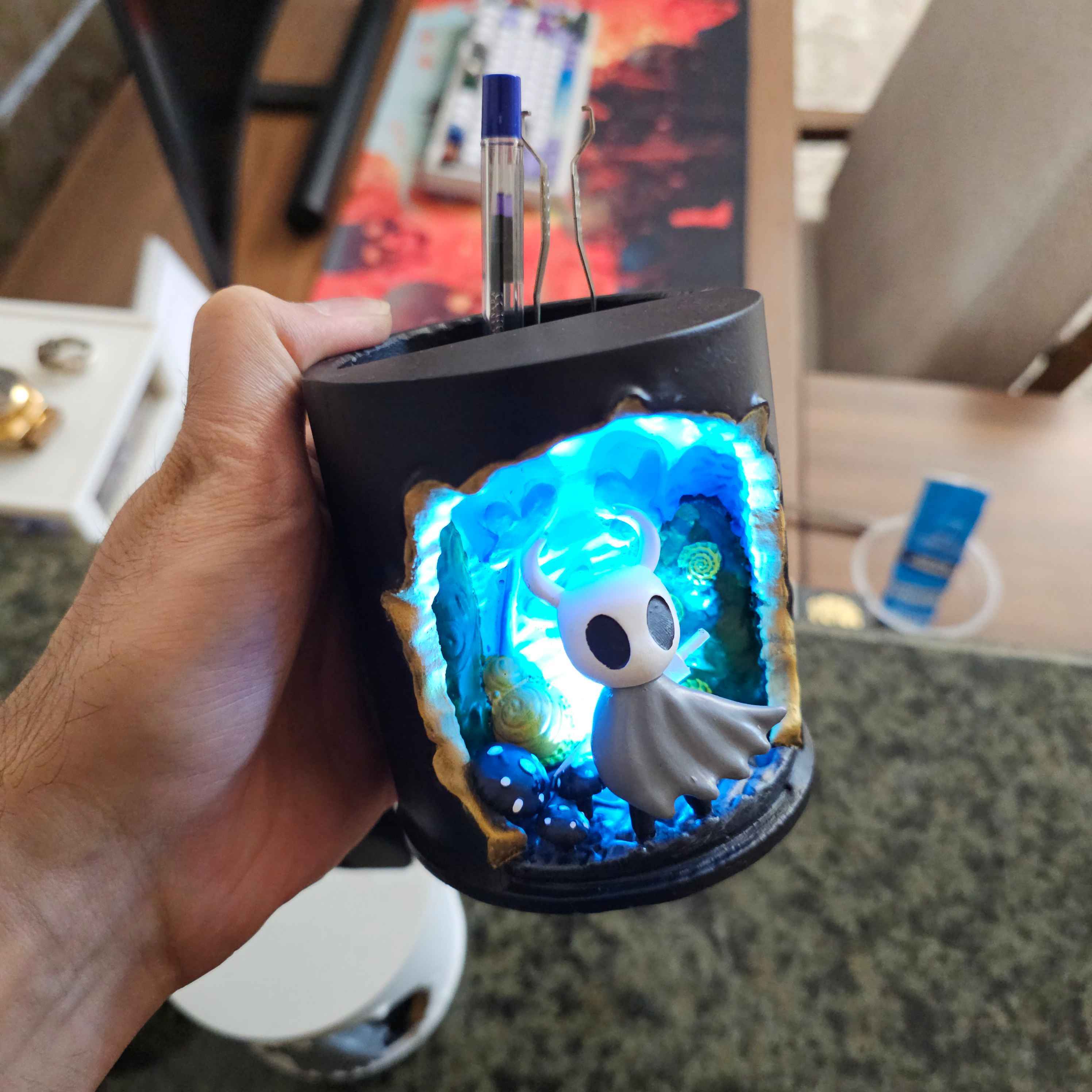 اگر از طرفدارهای بازی هالونایت Hollow Knight هستید، این جامدادی و چراغ دکوری سه‌بعدی دقیقاً برای شما ساخته شده!طراحی سه‌بعدی با جزئیات دقیق، نور LED آبی ملایم برای جلوه‌ی خاص در شب و فضای کار یا میز گیم شما.✨ ساخته‌شده با رزین و رنگ دست‌ساز✨ مناسب برای استفاده به‌عنوان جامدادی، نگهدارنده وسایل کوچک یا چراغ دکوری رومیزی✨ نور LED کم‌مصرف با عمر بالا💡 درصورت تمایل می‌توانید نسخه بدون نور را با قیمت کمتر سفارش دهید.کار کاملاً دست‌ساز است و هر قطعه با تفاوت‌های جزئی، خاص و منحصربه‌فرد خواهد بود. طراحی کار کاملا کار مجموعه خودمونه😉